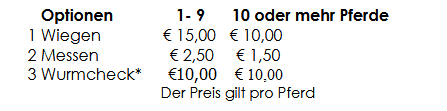 Je kunt je paard ook laten meten en ook een Mestonderzoek mogelijk is. Je vindt de prijzen in de volgende tabel: